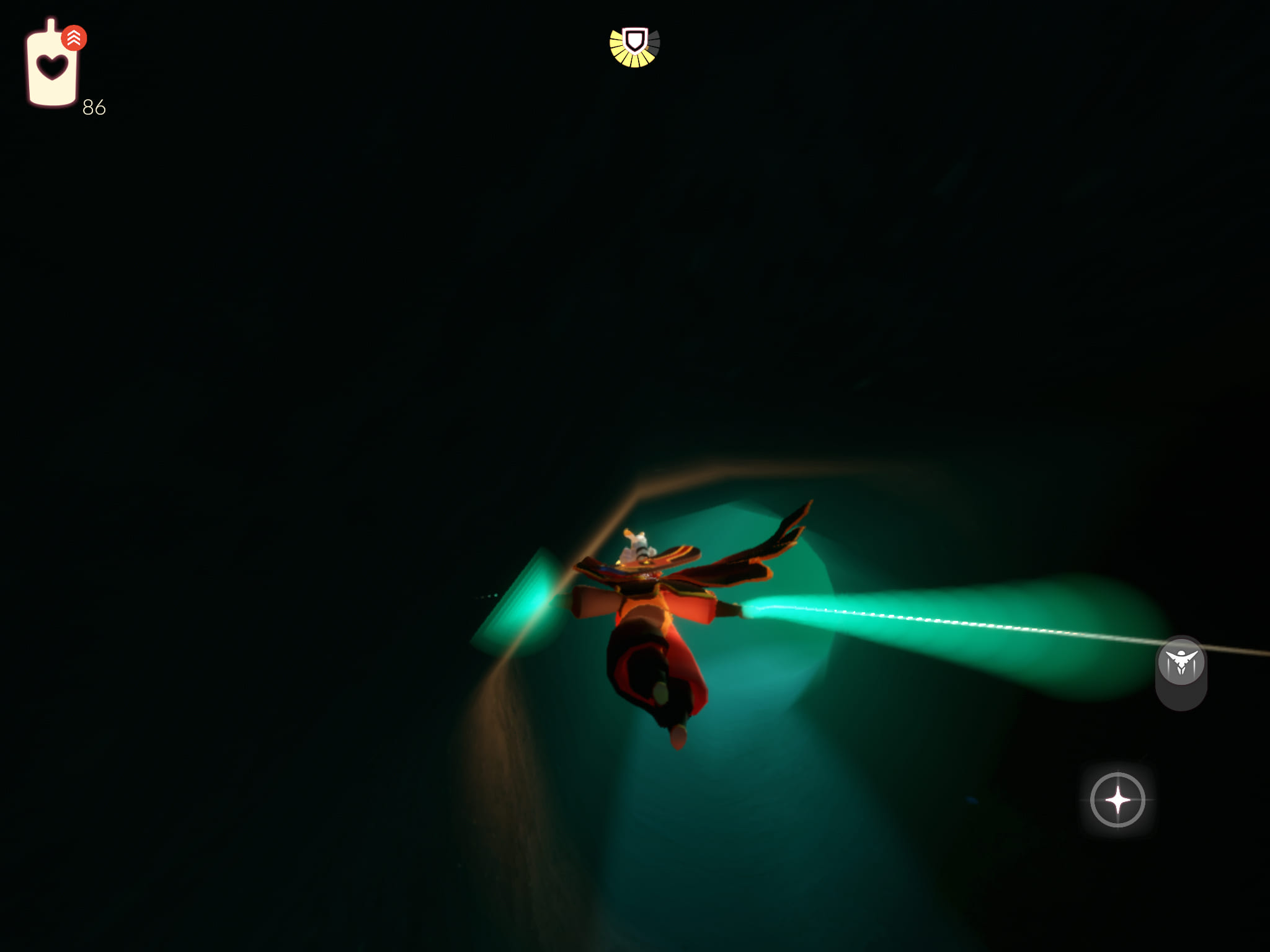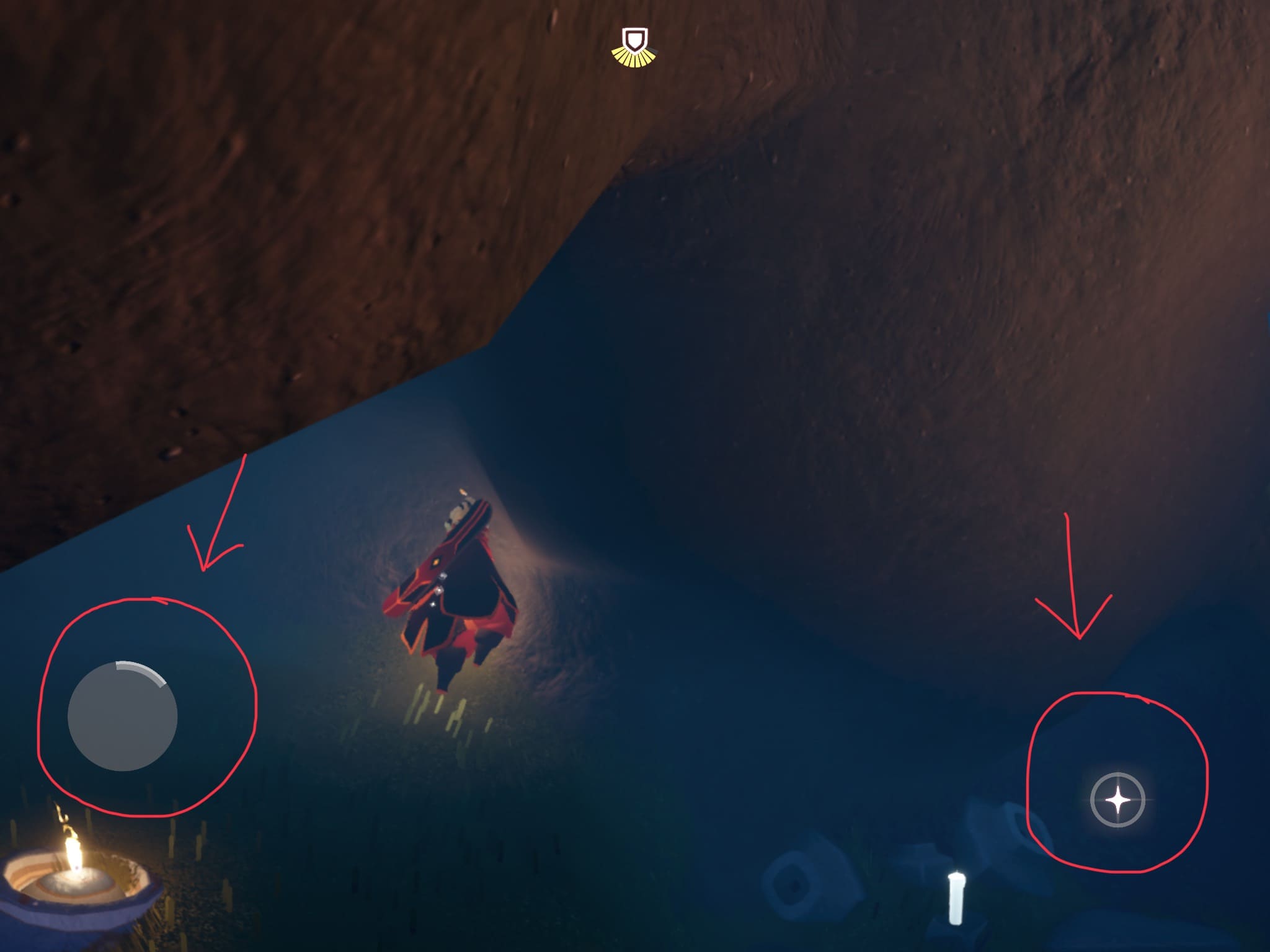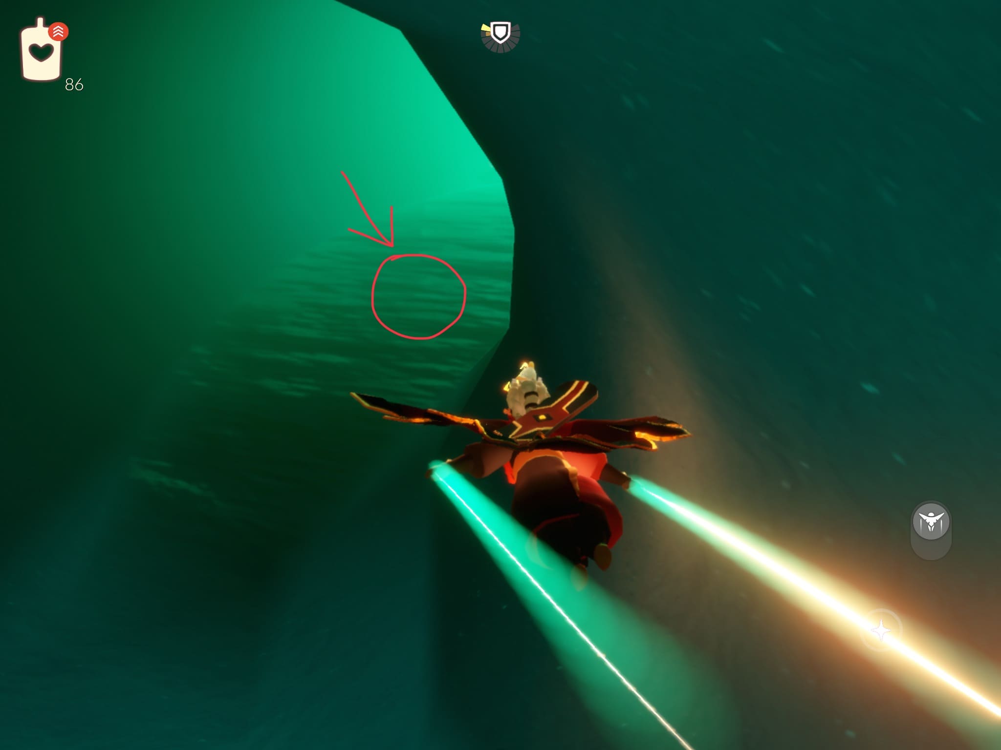 ➀:洞窟内に入ったら滑空モードで飛ぶ。